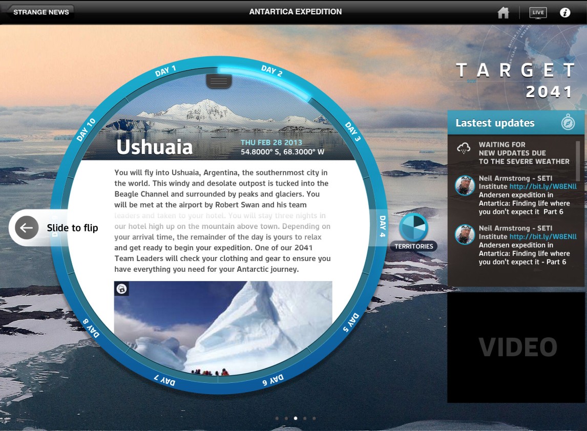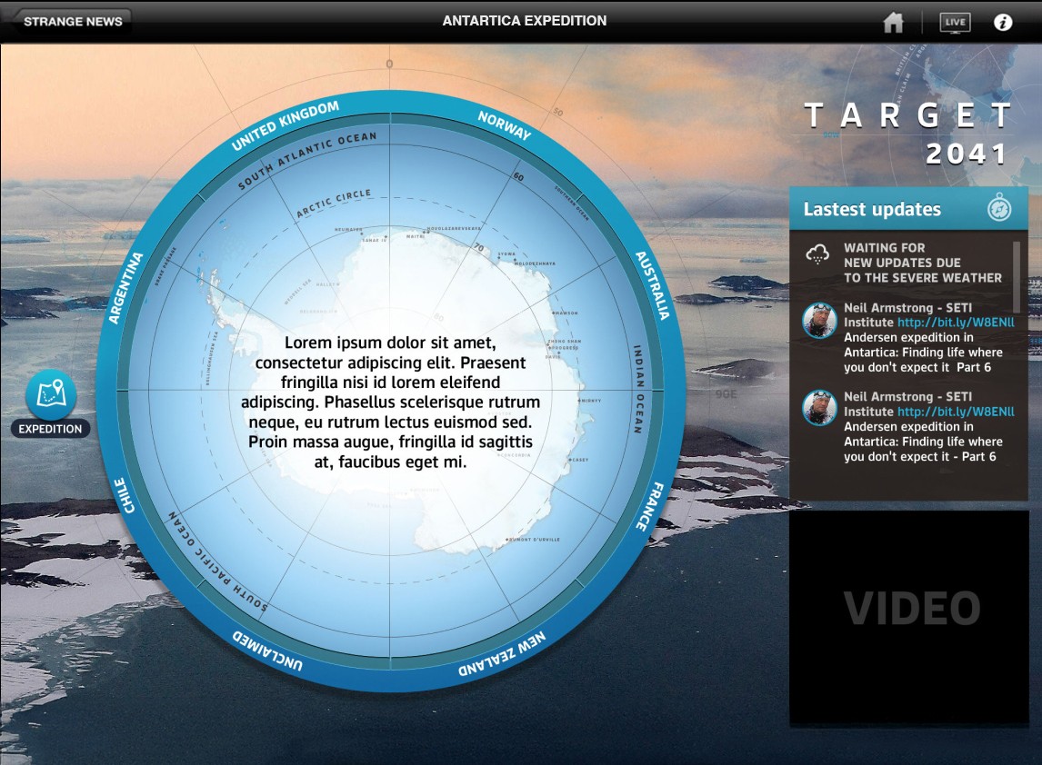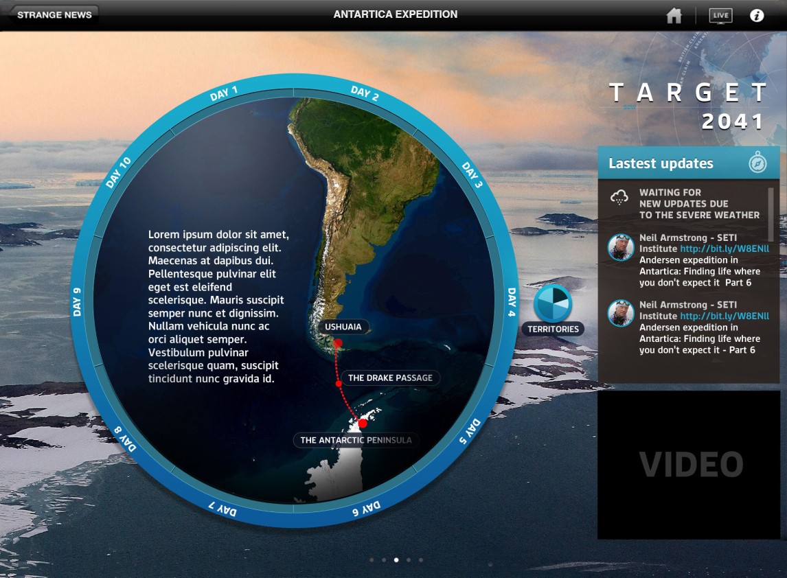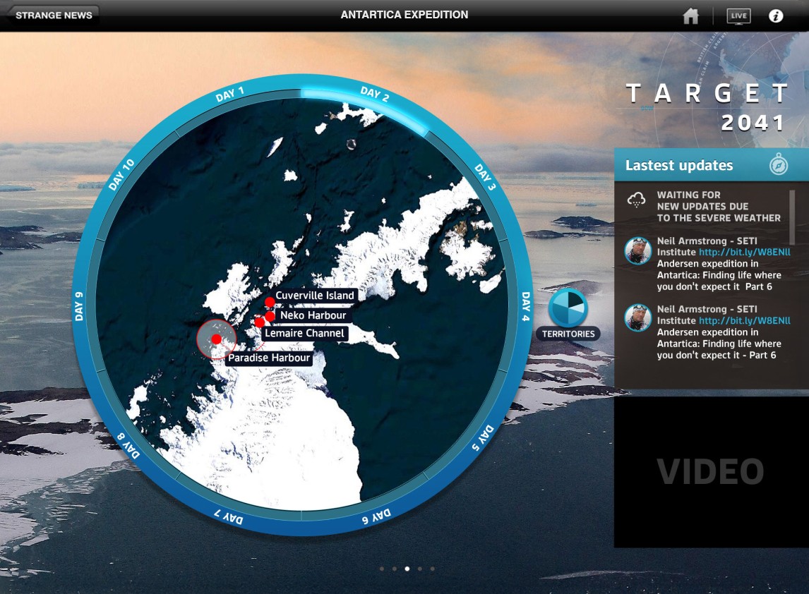 Sky News design team developed an app consisted of a ten day wheel that presented viewers with the main challenges faced to preserve the area, information about the continent, the team diaries and the zones already claimed by rich nations.